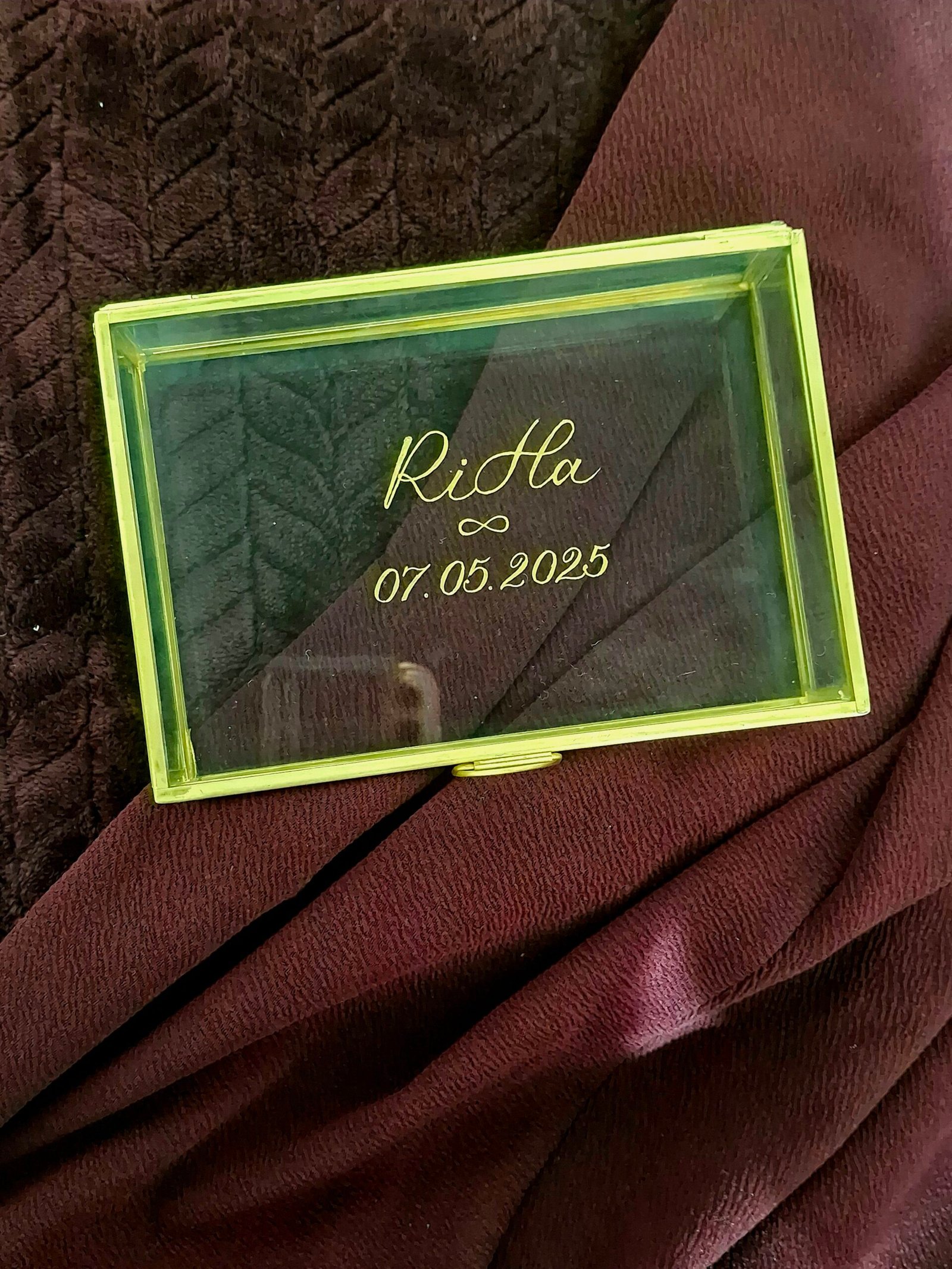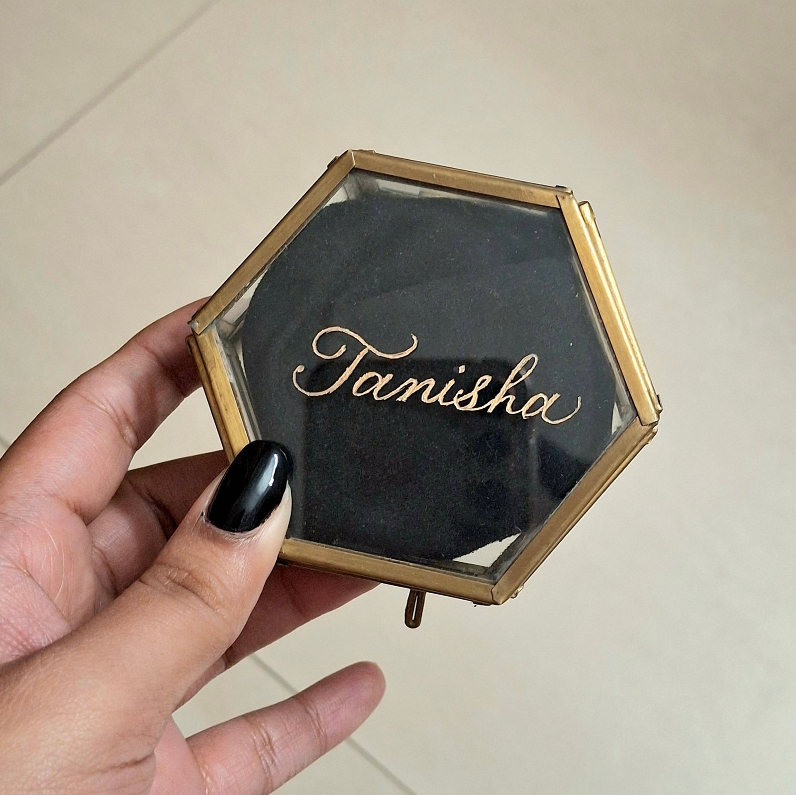 Category:Calligraphy & Engraving Tags:anniversary gift, brass glass box, bride keepsake box, custom date box, custom name box, elegant proposal box, engraved memory box, glass keepsake box, name engraved box, personalized gift box, proposal ring box, unique engagement gift, wedding return gift